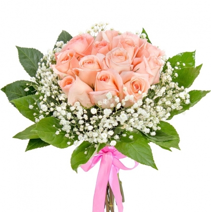 Розовые розы, гипсофила, салал | Купить букет