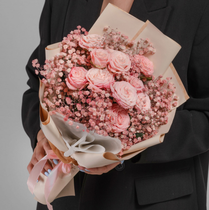 Букет из кустовых роз и гипсофилы в стильном оформлении